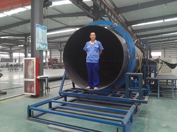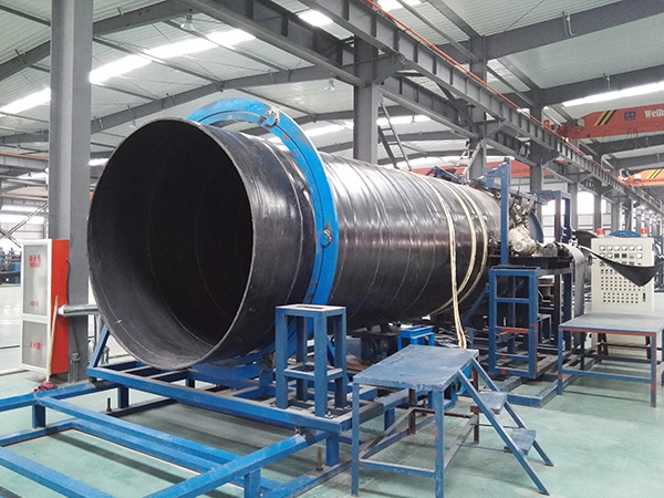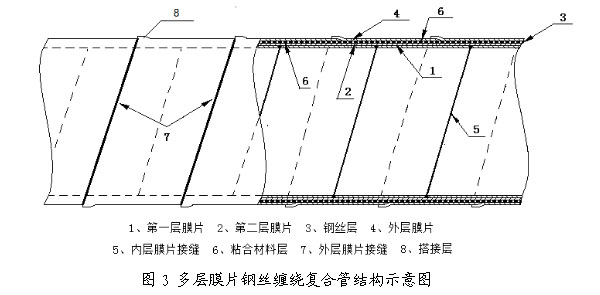中等口径的中低压管道可由两层必一体育平台_必一体育(中国)一站式服务平台同向螺旋缠绕热合而成,中间夹一层镀铜“过塑”高强度碳素弹簧钢丝,其拉伸强度可达1800MPa~2000MPa。每层必一体育平台_必一体育(中国)一站式服务平台都先在特种设备上复合一薄层高强度粘合材料。复合管材时外层必一体育平台_必一体育(中国)一站式服务平台的中线紧压在内层必一体育平台_必一体育(中国)一站式服务平台的接缝上。内层必一体育平台_必一体育(中国)一站式服务平台接缝在复合时先用焊枪焊接,外层必一体育平台_必一体育(中国)一站式服务平台接缝则采用搭接方式连接。两层必一体育平台_必一体育(中国)一站式服务平台敷胶面相向,连同钢丝大面积螺旋缠绕热压粘合,其粘合强度远超普通聚乙烯钢丝缠绕复合管。大口径管道则由3~4层必一体育平台_必一体育(中国)一站式服务平台加钢丝复合。管材结构详见图3。